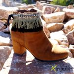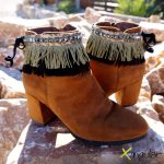 Cubrebotas Camuflaje está realizado con flecos de antelina, con flecos de color dorado y una cinta con tachuelas cuadradas.