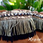 Materiales: Flecos de antelina, flecos de seda de color dorado y cinta con tachuelas cuadradas.
